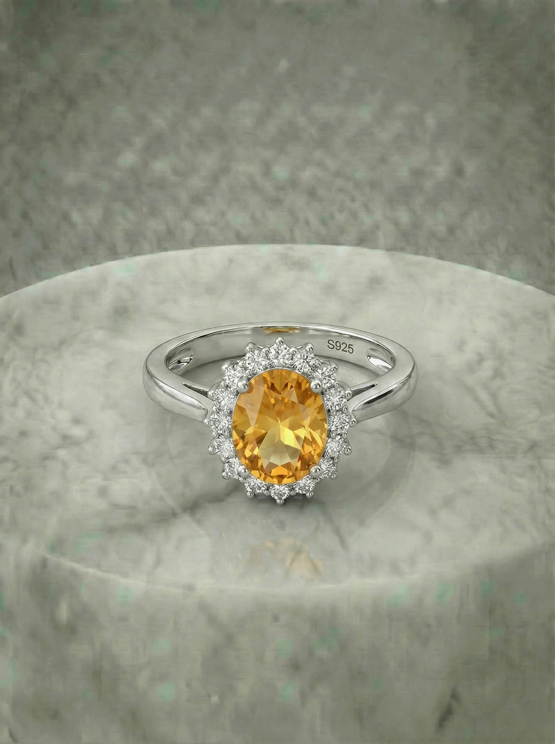Beschrijving: Deze ring met citrien is een unieke ring met citrien en diamant, geïnspireerd op de ringen van de Britse koninklijke familie, zoals prinses Diana en prinses Kate. U zult zich als een prinses voelen. De betoverende citrienring is bezet met een gele 1,8 karaat ovale natuurlijke citrien uit Brazilië en veertien imitatiediamanten. De sterling zilveren citrienring heeft een fijne band van 92,5% puur zilver.