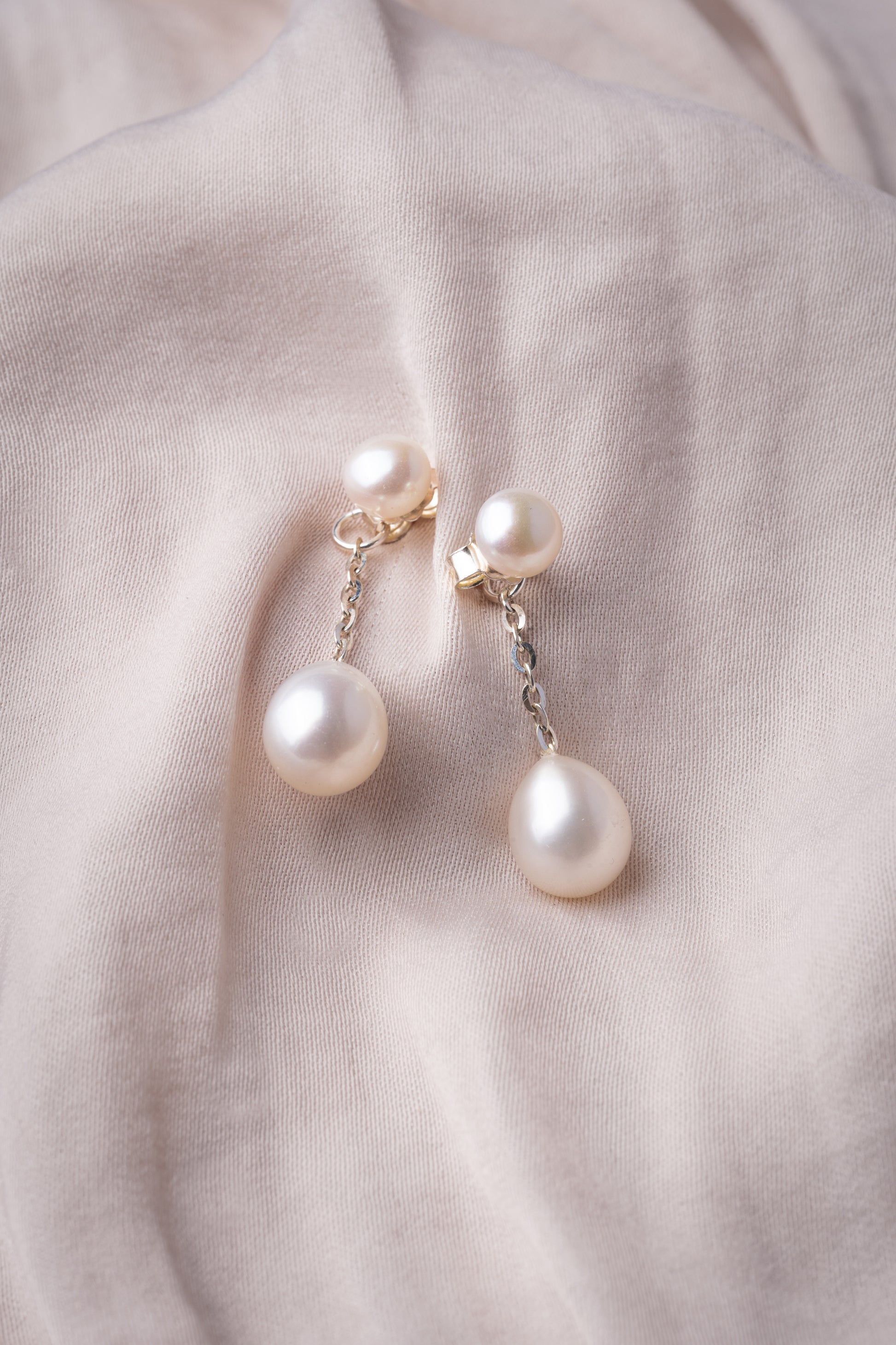 Description: These Real two Pearl Stud Earrings consist of four Genuine Freshwater Pearls. The White Pearl Stud Earrings are 7-8 mm in Size are combined with a smaller pearl and are set on Quality Silver Studs. They Naturally have their Near-oval Shape, High Luster and Ivory White Color and are a perfect choice for Bridal Pearl Earrings.