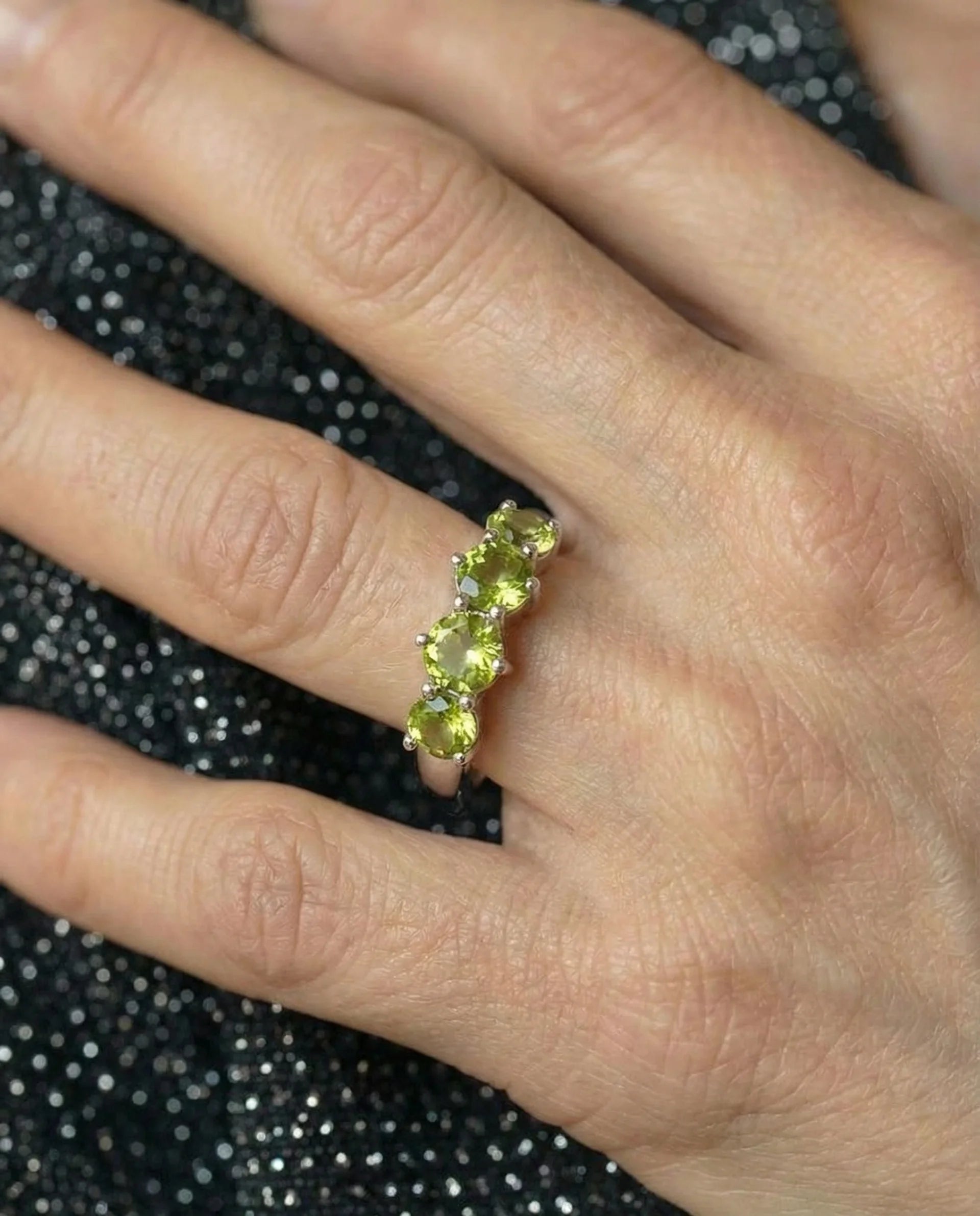 Deze Natuurlijke Peridot Eternity Ring toont levendige geelgroene peridot edelstenen gezet in een doorlopend bandontwerp. De stenen zijn vastgezet in een gepolijste sterlingzilver zetting die maximaal licht doorlaat om hun natuurlijke glans te versterken.