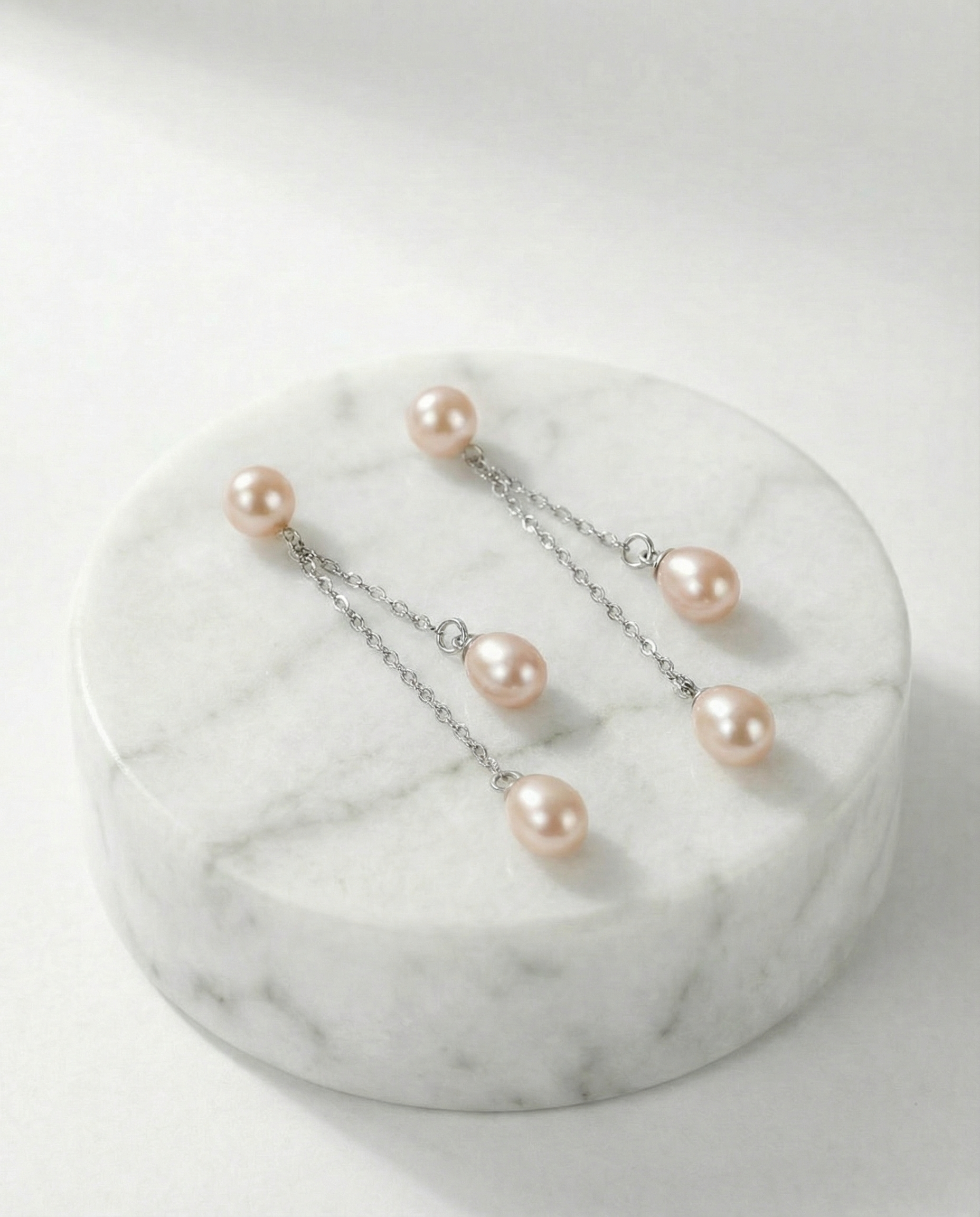 Met drie natuurlijke perzikroze parels die sierlijk aan 925 zilveren kettinkjes hangen, vangen deze oorbellen het licht bij elke beweging.