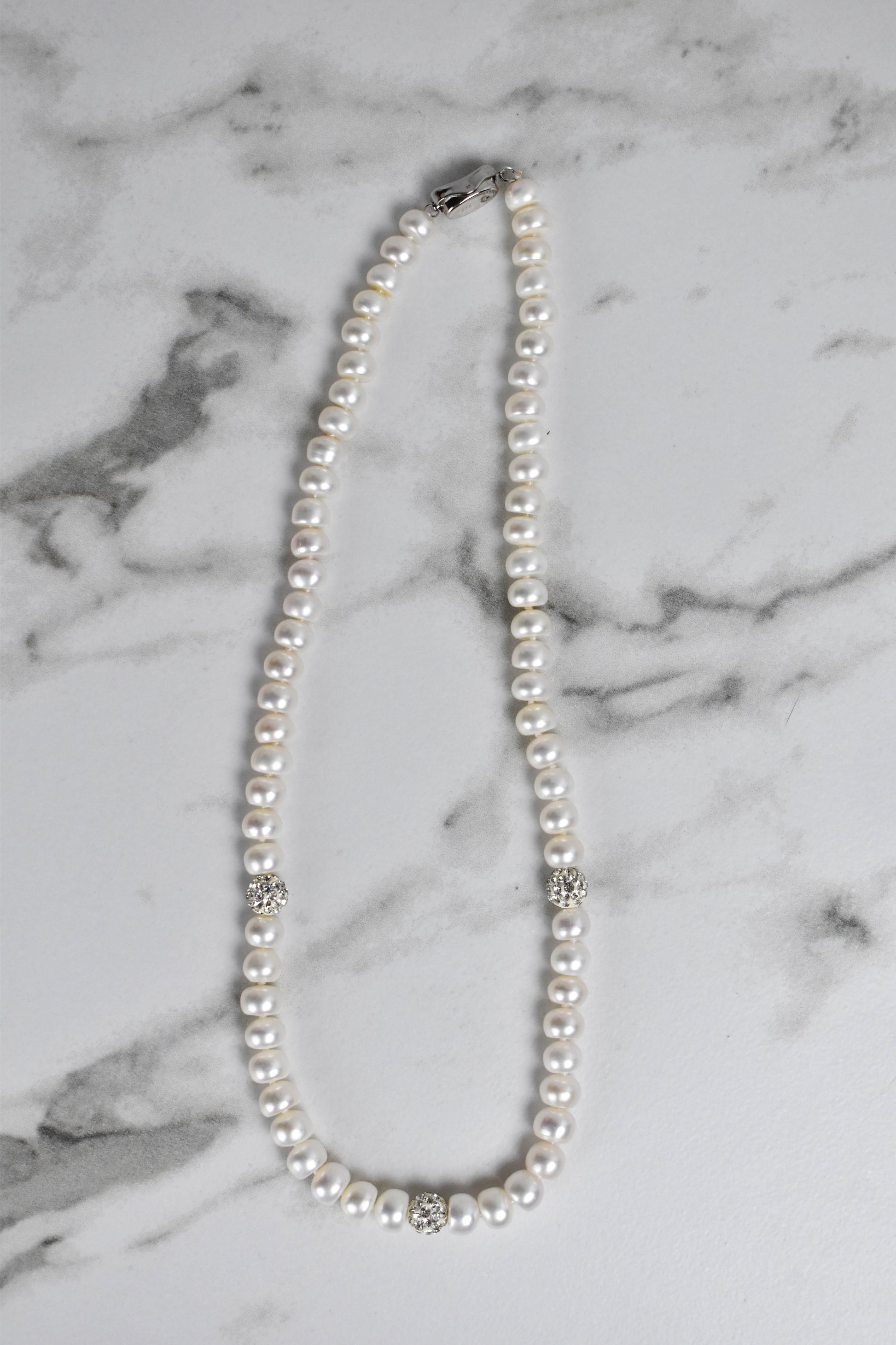 Description: This Real Ivory White Pearls Necklace has 62 Ivory Real Precious Pearls. The Genuine 5-6 mm sized Pearls and 3 graceful Zircon Balls are held by a very strong cord. The Oval Shape, High Luster and Ivory Color of these Beautiful Pearls are all Natural. The Pearl Necklace Silver Connector makes the Necklace easy to open and close.