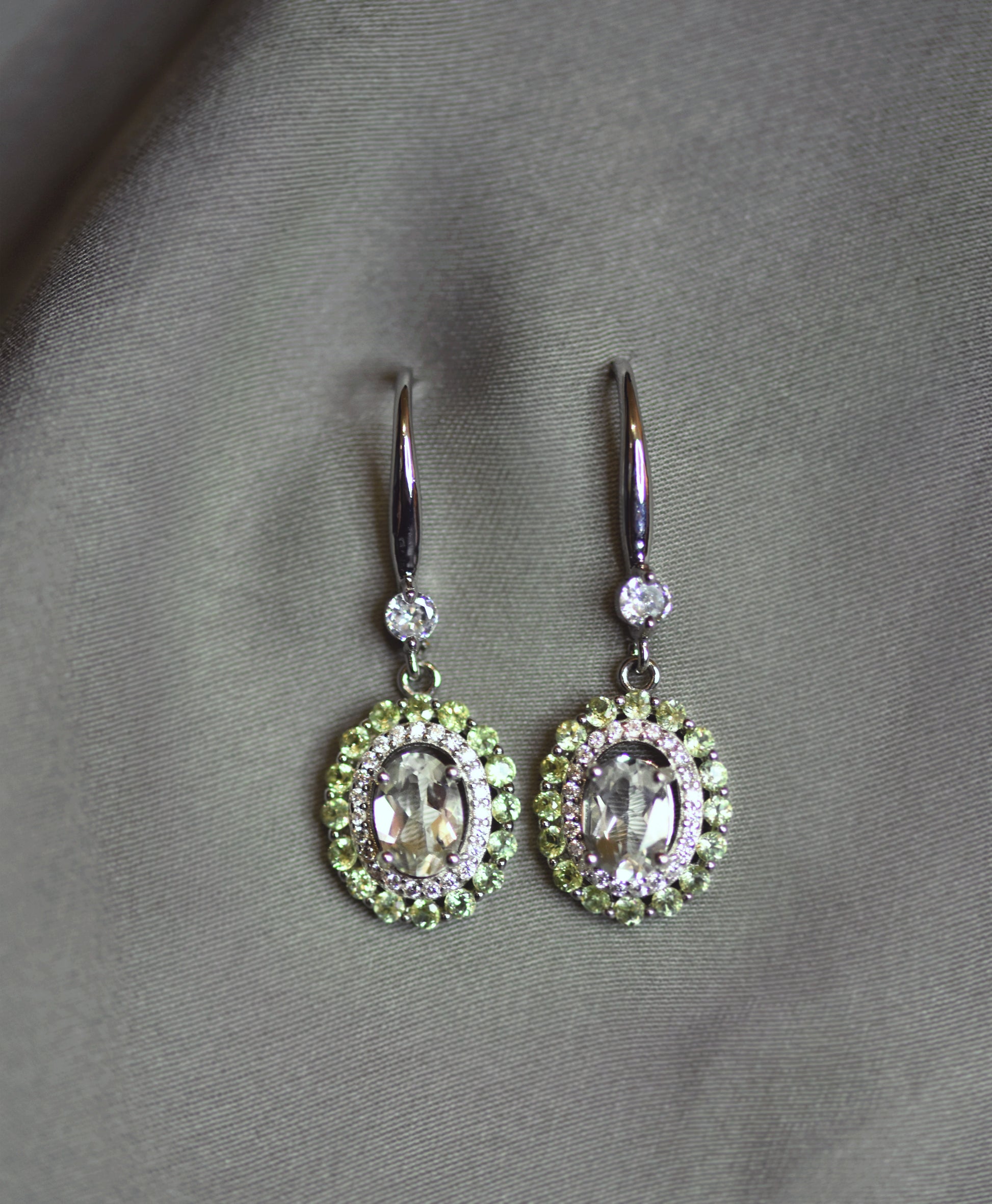 Description: These Fine Peridot Earring have a Detailed Design with a 1.2 carat Oval Cut white green Amethyst per earring (2.4ct in total) surrounded by a row simmulated diamonds and 14 peridot stones each set in 92,5% Fine Silver. You can perfectly combine them with our matching Peridot Engagement Ring.