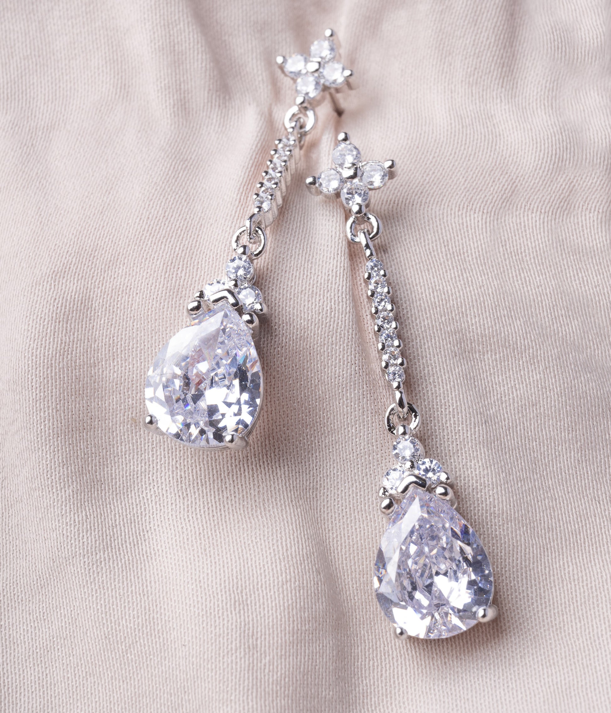 Description: This set of Dangling Simulated Diamond Earrings starts with 4 oval simmulated diamonds attached to a chain with 6 small diamonds. At the bottom dangles the larger simulated diamond oval stone of 1.75 ct (3.50 ct in total) The diamonds are set in 92.5% Pure Silver. This trendy pair of earrings gives an extra glow and shine to every wearer.