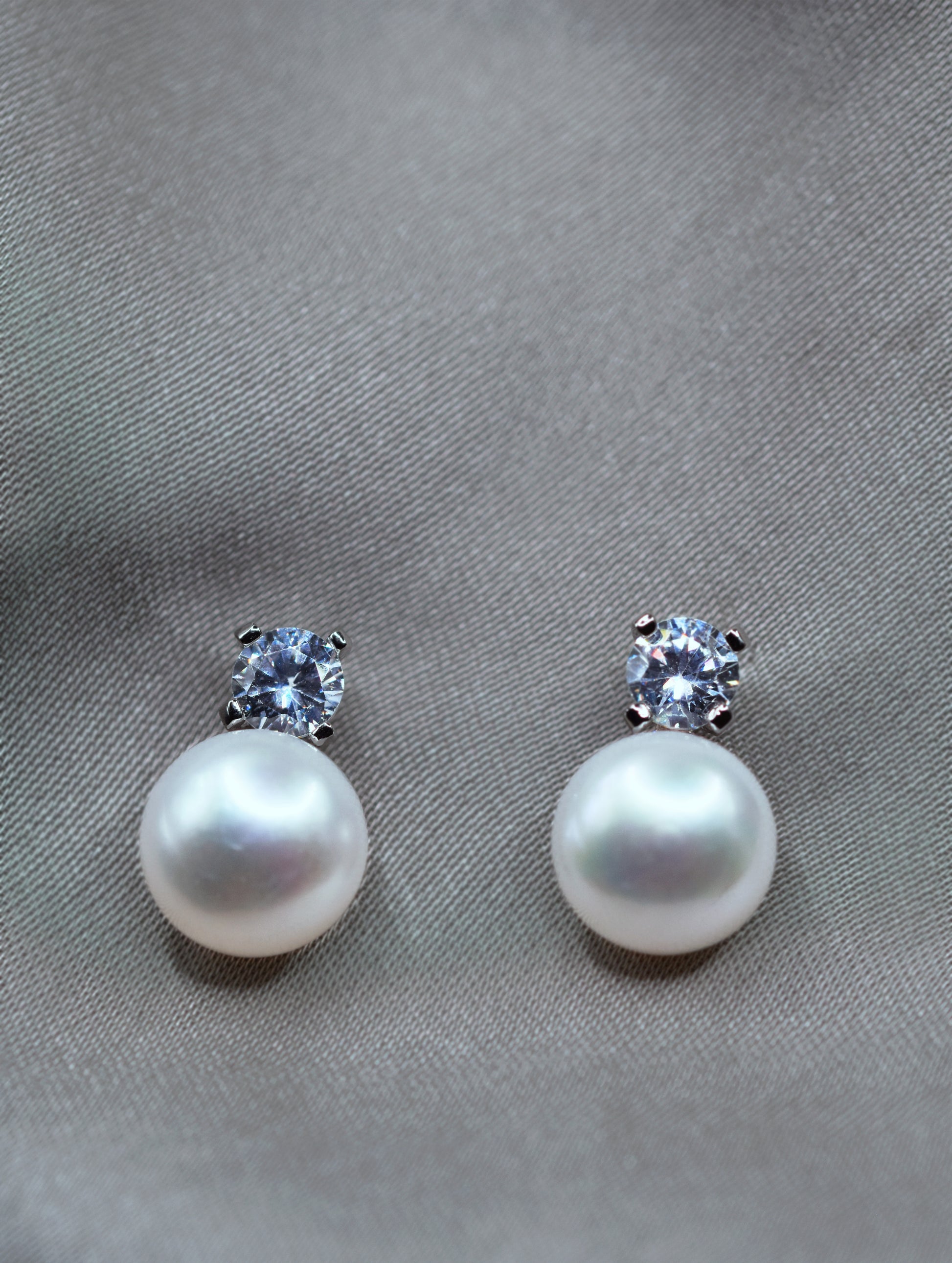 Description: These Real Pearl Stud Earrings consist of Two Genuine Freshwater Pearls. The White Pearl Stud Earrings are 8-9mm in Size and are set on Quality Silver Studs. with Diamond Simulant draped on top. They Naturally have their Near-Round Shape, High Luster and Ivory White Color and are a perfect choice for Bridal Pearl Earrings.